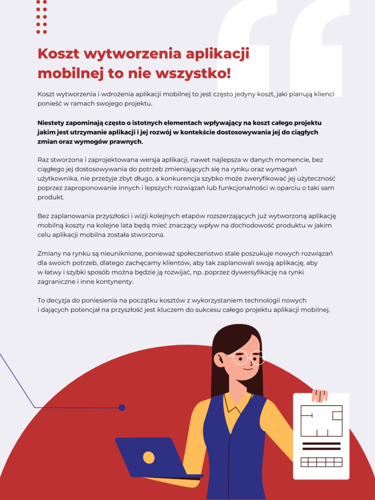 Samo stworzenie aplikacji to niestety nie koniec wydatków. Aby poprawnie działała i była bezpieczna dla użytkowników, konieczne jest ponoszenie dodatkowych kosztów, obejmujących między innymi: